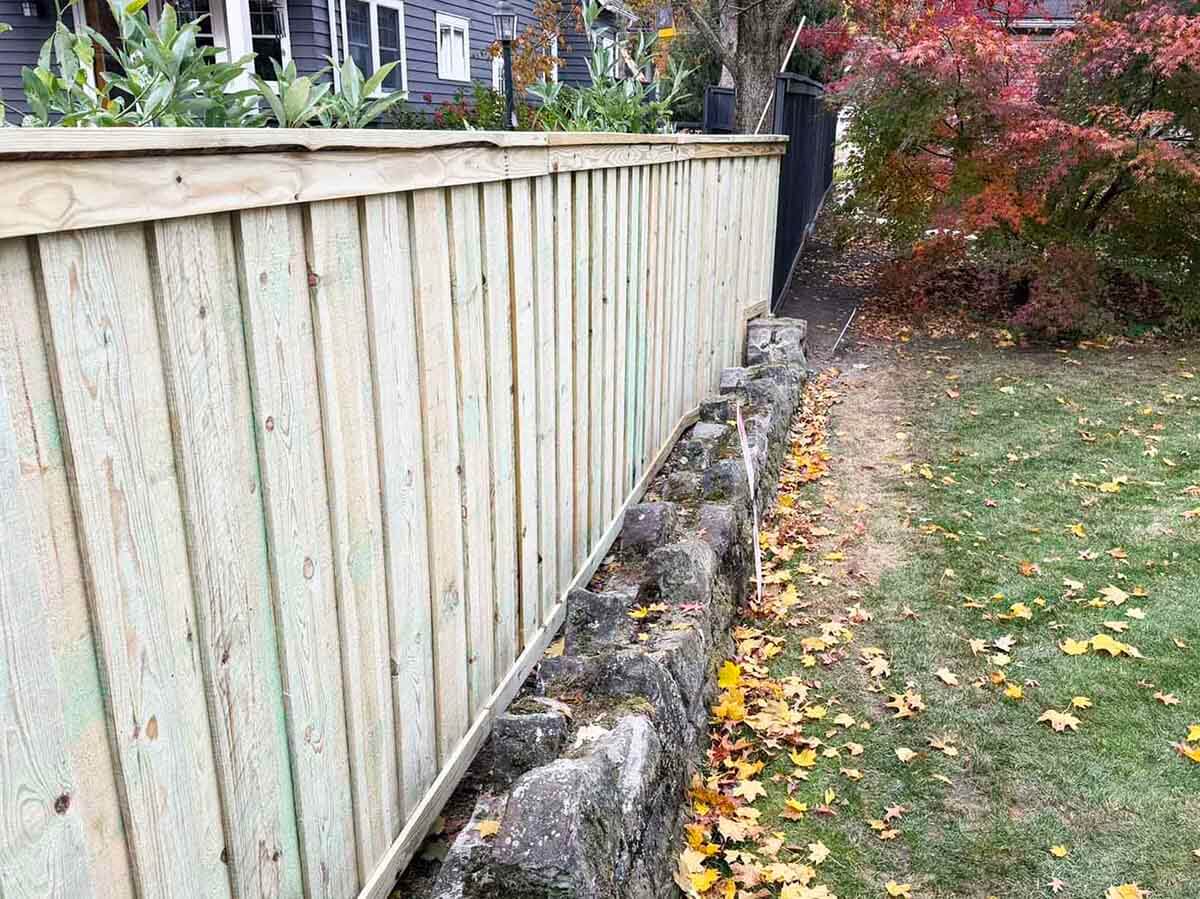 We assemble every fence piece by piece rather than using any out-of-the-box panels. Installing our fences with dimensional lumber allows us to slope the fence with the ground, drastically reducing large gaps beneath the fence. We generally use two-by lumber for the main supports instead of the typical one-by used on most prebuilt wood panels.